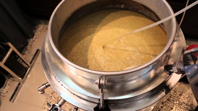 - Охладить кашу до 67–68 градусов и добавить 150 грамм перемолотого солода.