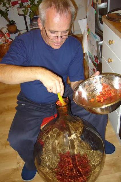 закупорить пробкой с трубкой для ферментации и поставить в помещение с температурой около 20 °С. В процессе брожения плоды медленно опускаются на дно.