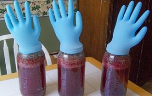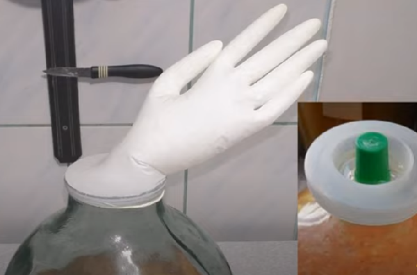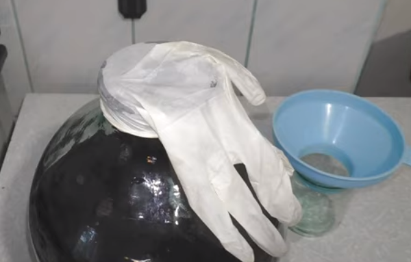 гидравлический затвор необходим для удаления углекислого газа, который накапливается в емкости из-за брожения. Сегодня это устройство можно купить в специализированных магазинах или изготовить самостоятельно. Самая популярная конструкция гидрозатвора — знакомая латексная медицинская перчатка с отверстием на одном из пальцев. Если брожение идет полным ходом — перчатка набухает как клубок, процесс остановился — перчатка отваливается.
