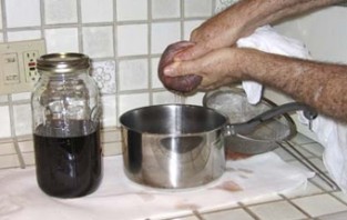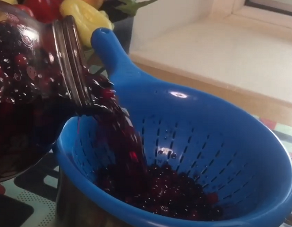 - На следующий день процеживаем настой через марлю, отжимая руками сок из ягод.