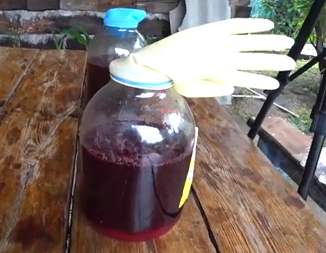 10. Когда брожение прекращается, что каждый винодел определяет по отсутствию бульканья в водяном затворе или по выдуванию перчатки и осветлению виноматериала, вино удаляется от осадка с помощью соломинки.