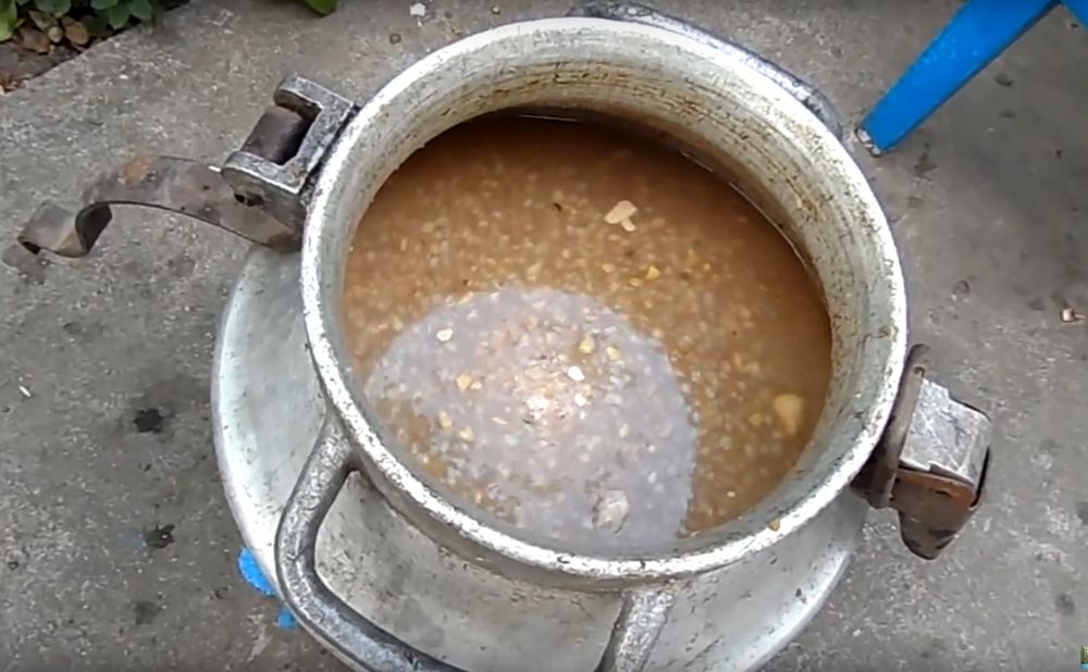 - Полученную кашу вываливаем в бродильную ёмкость и добавляем половину всего объёма воды (по рецепту — 6 литров).