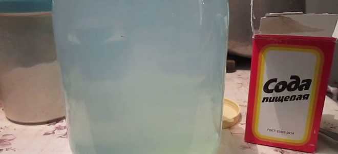 - Берём соду в пропорциях 10 грамм на 1 литр продукта и перемешиваем её с таким же количеством воды (10 грамм соды на 10 мл воды).