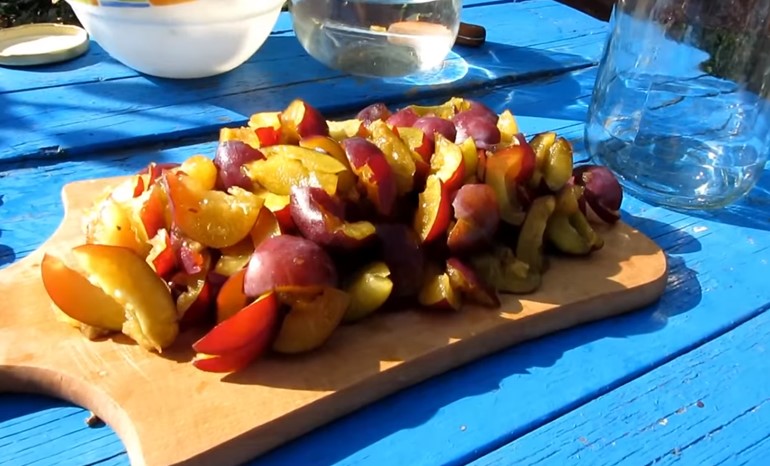 На первом этапе необходимо сначала выбрать сливы и яблоки. Удаляем плохие и гнилые плоды. Теперь сливу нужно отделить от семян. Разламываем их пополам и удаляем косточки. Яблоки нарезать небольшими дольками.