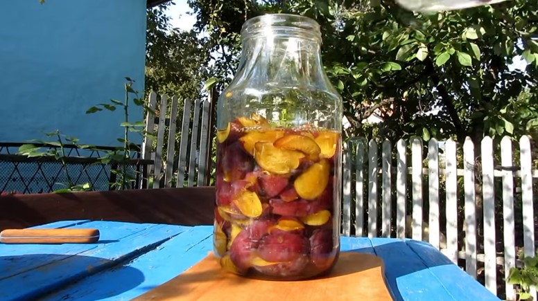 На количество слив берется основная часть, и достаточно нескольких яблок. Так на 1 кг фруктов нужно 80% слив, а остальное — яблоки. Дополнительно на эту гирю берем 1 литр воды и 300 г сахара.