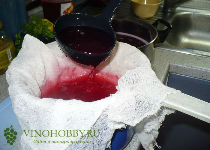 - Полученный кусок процедить через сложенную в несколько раз марлю, хорошо отжать. При необходимости еще раз процедите ватным тампоном между слоями марли. В напитке не должно быть клетчатки, кожуры или семян ягод.