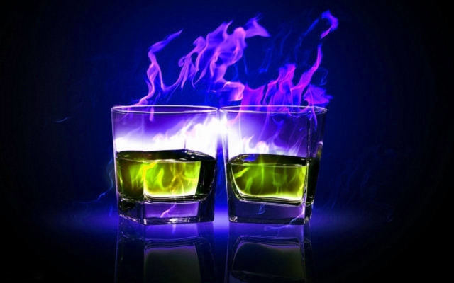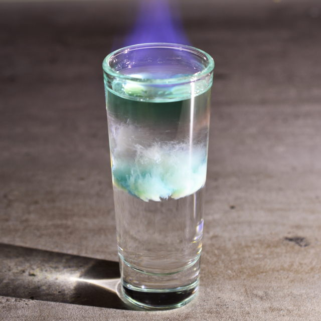 Наполните стакан обоими видами спирта и подожгите. Когда пламя погаснет, выпить залпом.