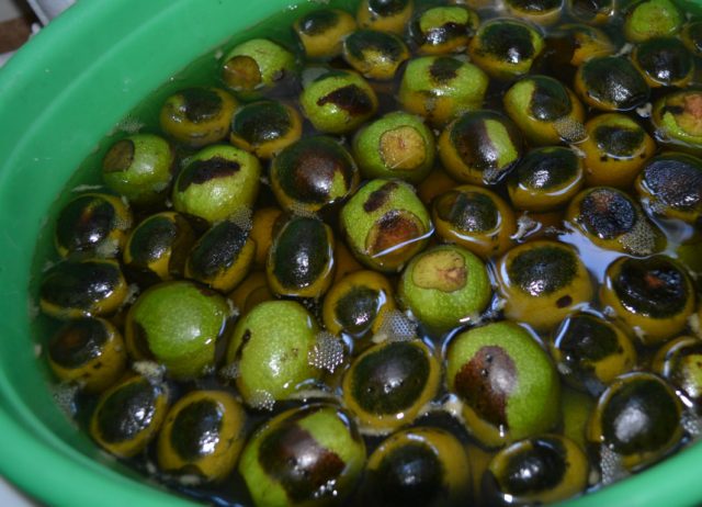 - Незрелые орехи моют, накалывают в нескольких местах иглой или вилкой и, залив водой, вымачивают около 15 дней. Воду меняют 2 раза в сутки – утром и вечером.