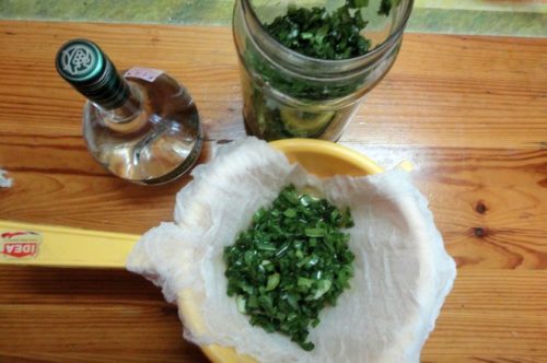 - Необходимо измельчить заготовленное и сырье после чего взять 30 гр измельченных листьев. Их заливают 250 мл водки либо спирта. Емкость оставляют в теплом месте и выдерживают в течение 10 дней. Затем средство процеживают и применяют в качестве лекарства. Его активно используют в виде компрессов, промывают раны. При отите настойку закапывают в ухо по 2 капли перед сном.