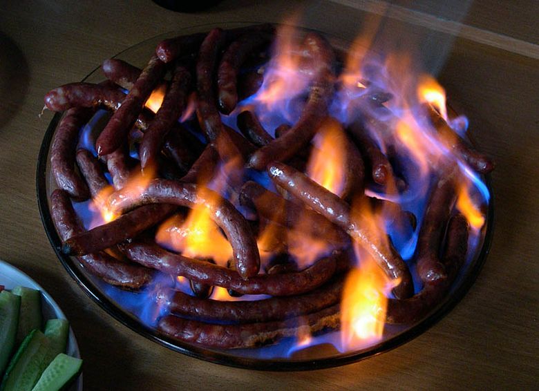 - Возможность жарки. Существует несколько рецептов, которые готовятся непосредственно в спиртовом пламени. Например, сосиски. Они просто выкладываются в сковородку, немного заливаются крепким алкоголем и поджигаются. Поэтому заранее проверяют горение алкоголя, чтобы не переводить продукт.
