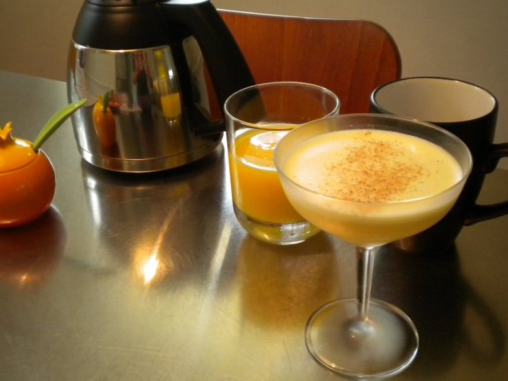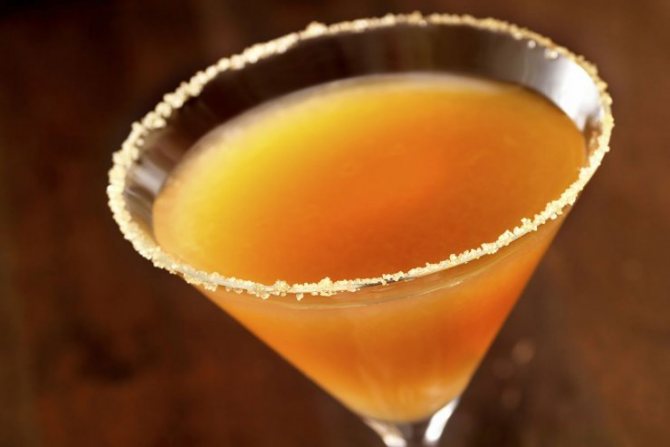 Состав: 20 мл коньяка, 25 мл классического мартини, 20 мл сока манго, грейпфрута или персика.