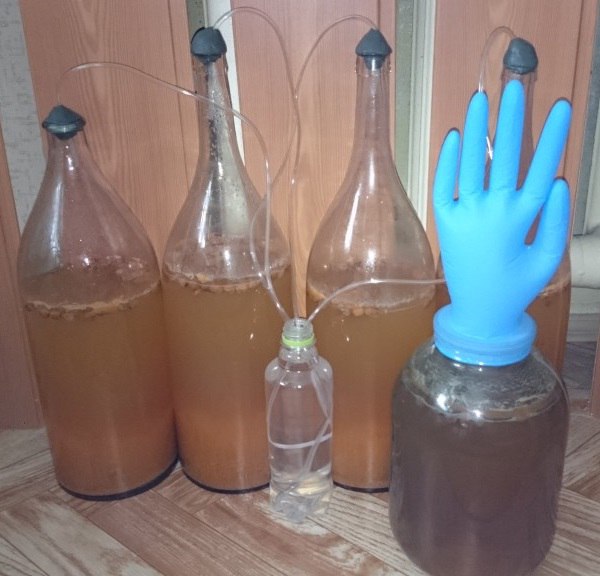 В отфильтрованное вино добавляем 150 грамм сахара и лимонную кислоту. Устанавливаем гидрозатвор (можно использовать перчатку с проколотым пальцем, но это не рекомендуется) и относим в тёмное место, где оно будет стоять от 35 до 60 дней.