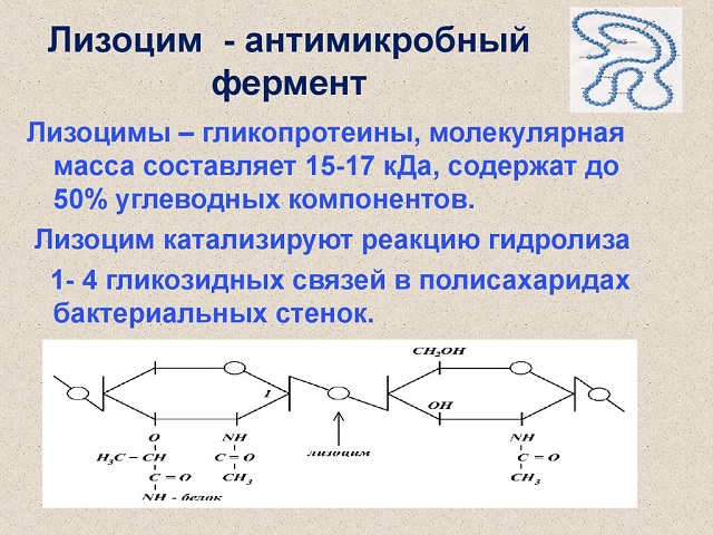 Лизоцим — это вещество, относящееся к классу природных антибактериальных ферментов. В фармацевтических целях его извлекают из белков куриных яиц. Фермент лизоцим также является безопасным пищевым консервантом. Вещество естественным образом находится в определенных органах и тканях человеческого тела, включая слизистые оболочки желудочно-кишечного тракта. Он состоит из триптофана, а также содержит 129 аминокислот, хлоридов и лактатов.