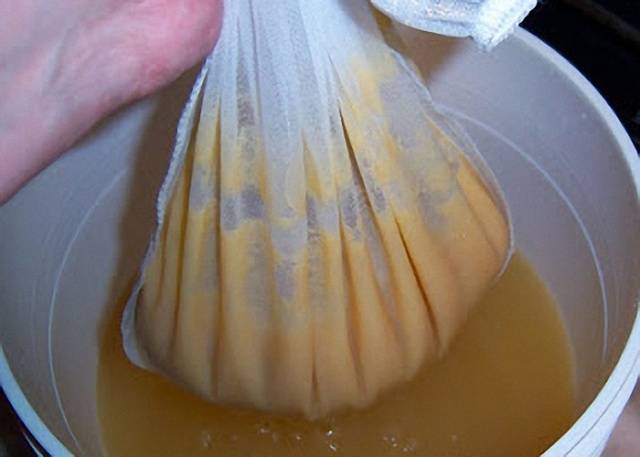Как только началось активное брожение, об этом свидетельствует пена на поверхности и шипение в бутылке, необходимо процедить и отжать жмых. Делается это через мелкое сито или обычную марлю. Если выжатое сусло оказалось мутным, ничего страшного. На это влияет сорт груши.