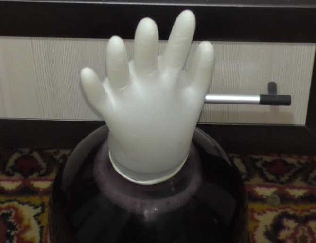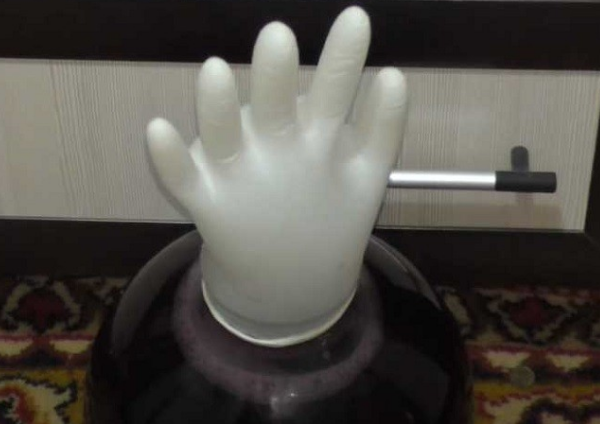 - Надеваем на горло медицинскую перчатку и делаем прокол в одном из пальцев иглой. Емкости с молодым вином ставим в темное место. В начале брожения перчатка набухнет.