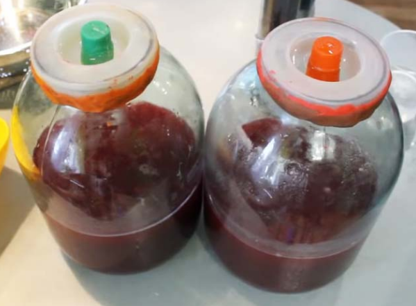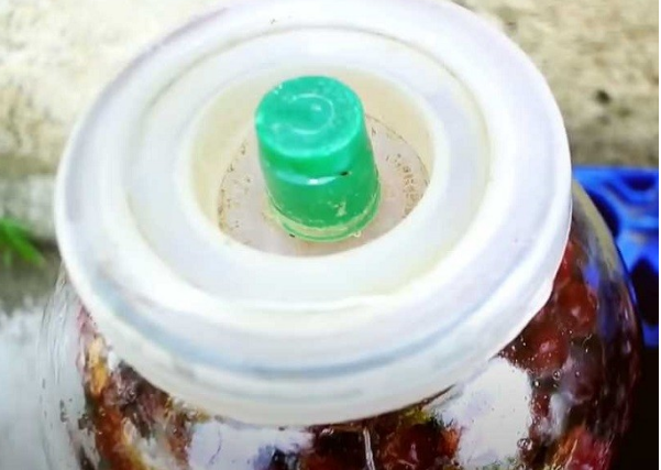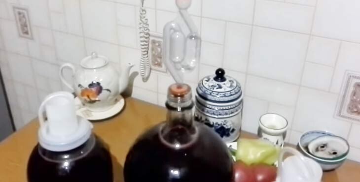 Если у вас нет такого устройства, вы можете использовать обычную медицинскую перчатку. О способе приготовления с его помощью смотрите следующий рецепт. На горлышко банок надеваем гидрозатвор и размещаем банки в защищенном от солнечных лучей помещении. Вино будет бродить 20-30 дней. Вы узнаете об окончании процесса брожения по тому, как заслонка перестает пузыриться.
