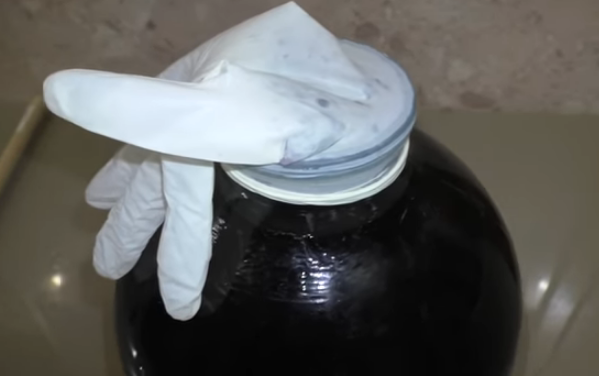 - Наденьте перчатку с дырочкой на палец или гидрозатвор и дайте вину настояться 30-40 дней. Пока идет брожение, перчатка надувается. Когда он спадет, процесс брожения можно считать завершенным.