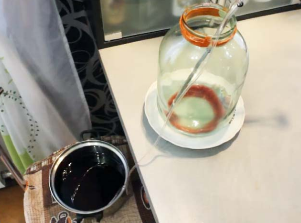 7. Через 11 дней, когда процесс брожения остановится, слейте воду, отделив осадок. Банку с вином ставим под гидрозатвор и отправляем в прохладное место.